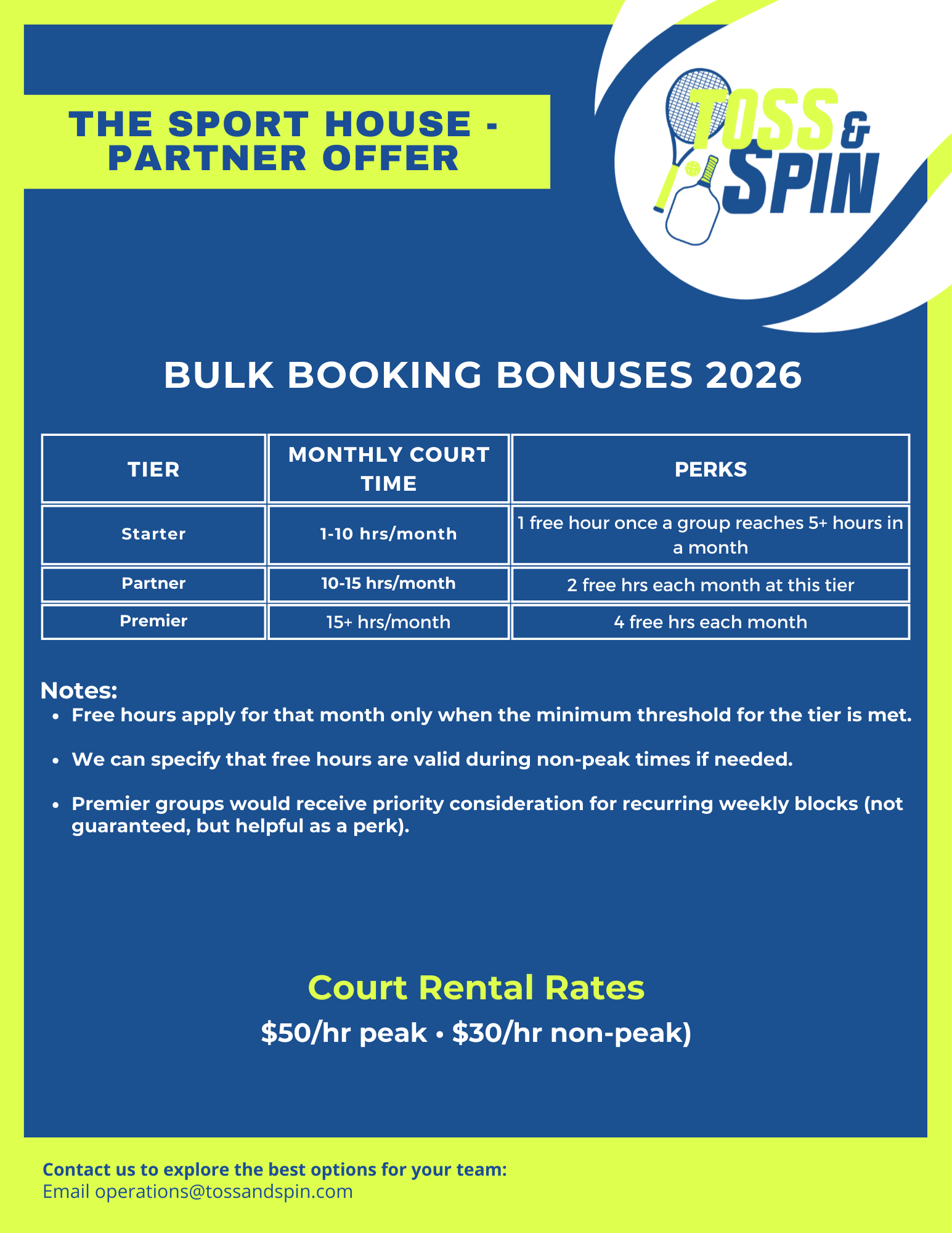 Register Now!Check out our court booking offers with unbeatable value for teams, clubs, and groups who book courts regularly. Our Bulk Booking Bonus Program rewards your commitment with free court hours, priority scheduling, and flexible perks designed to support consistent play. Whether you're a casual group...